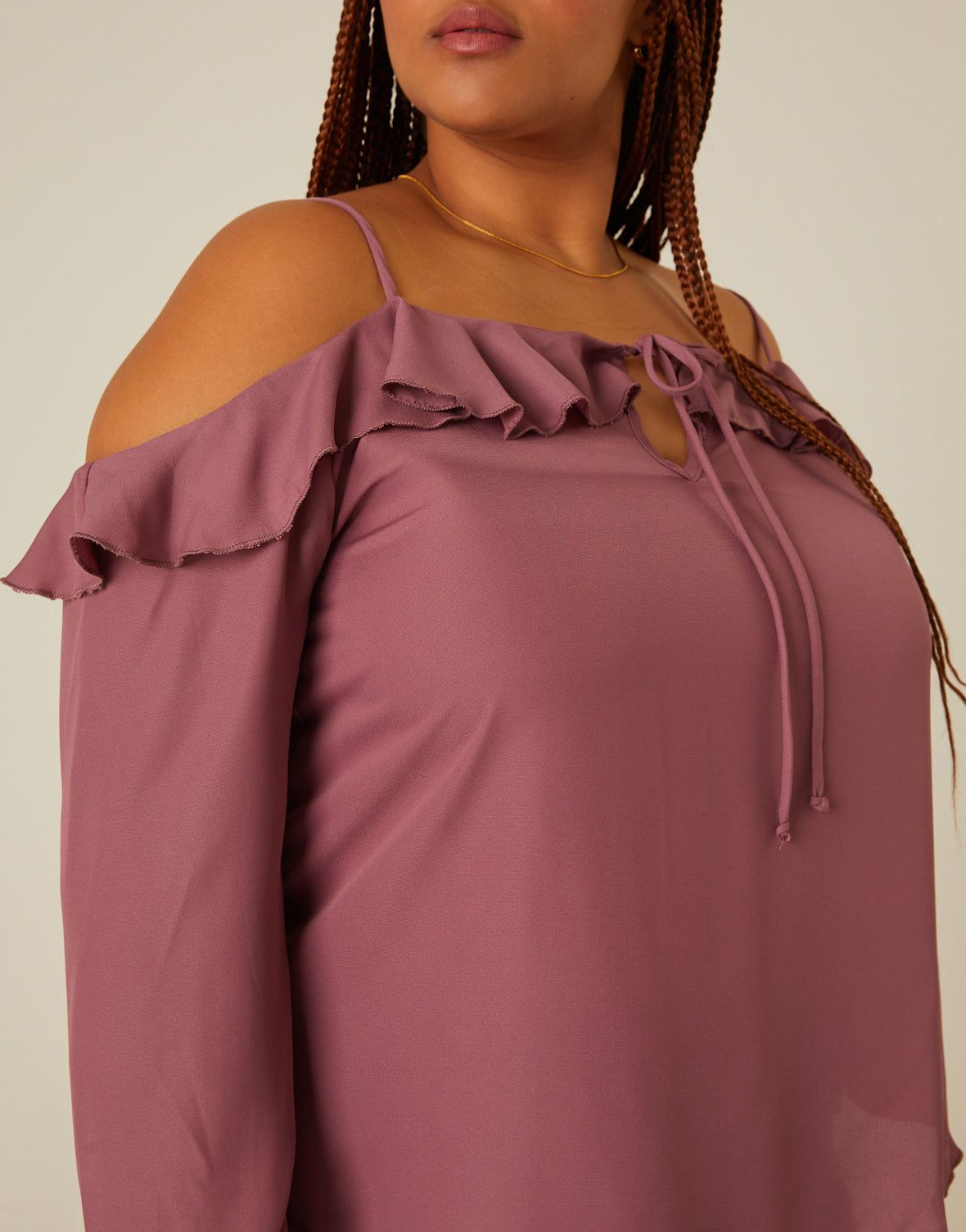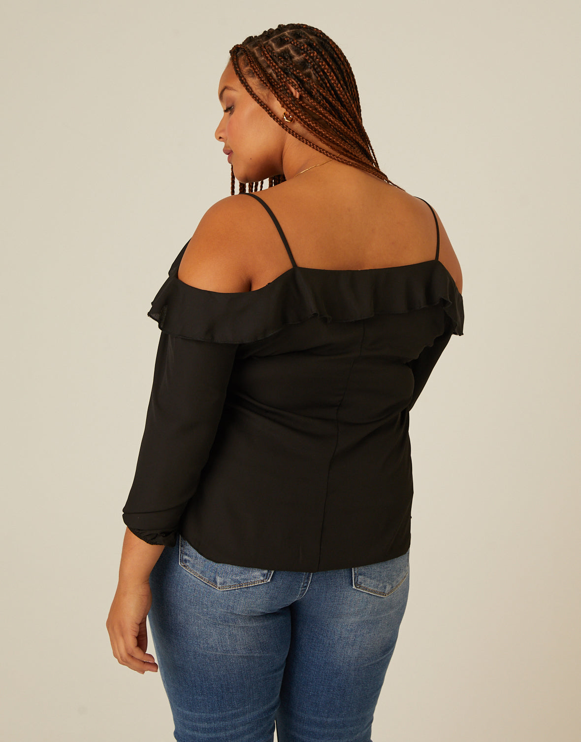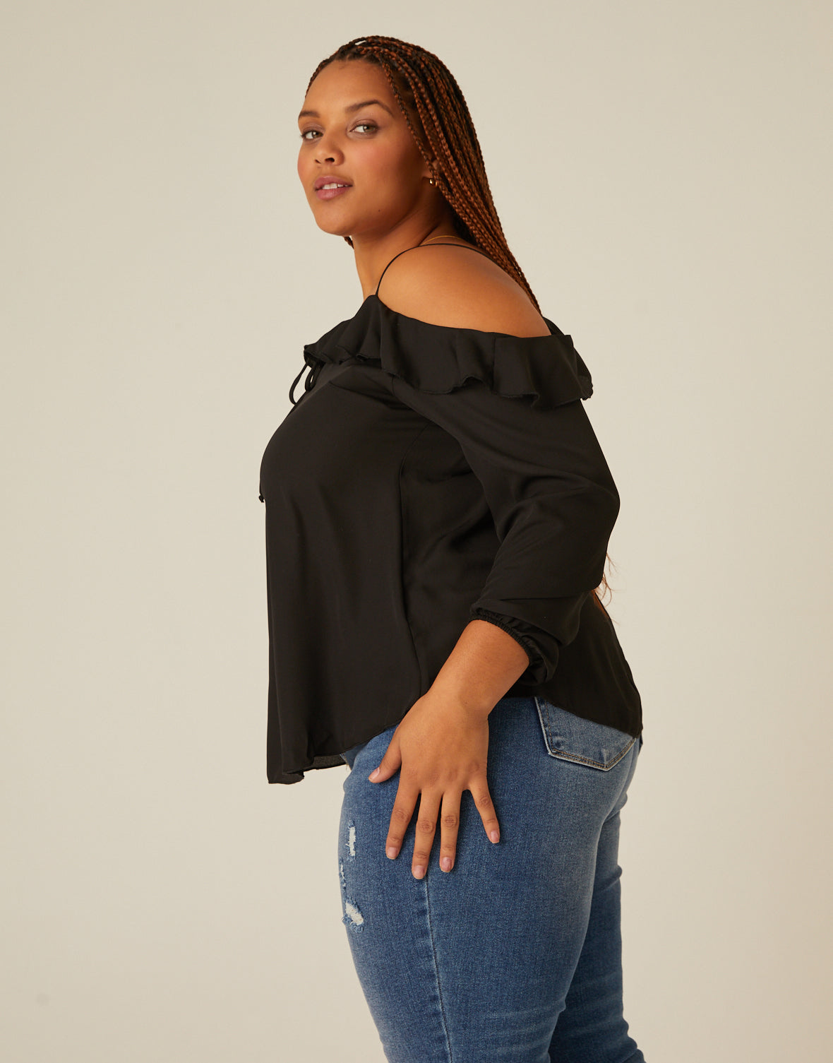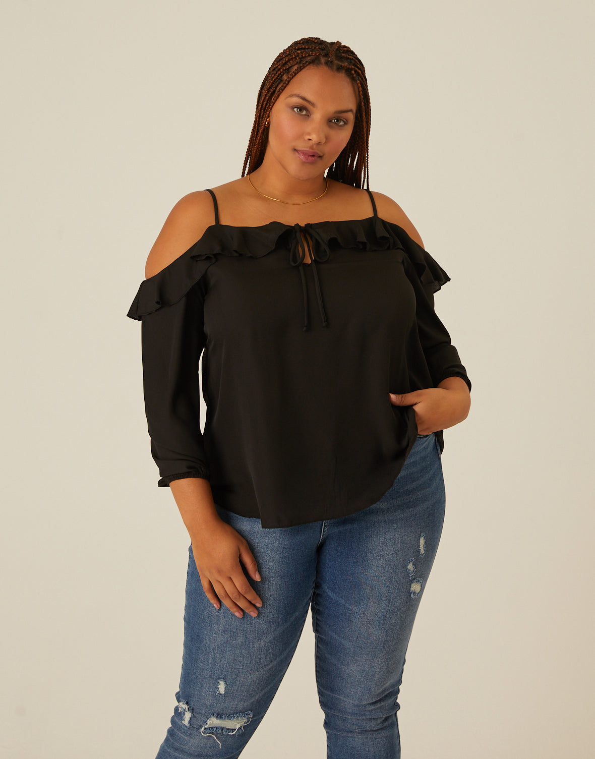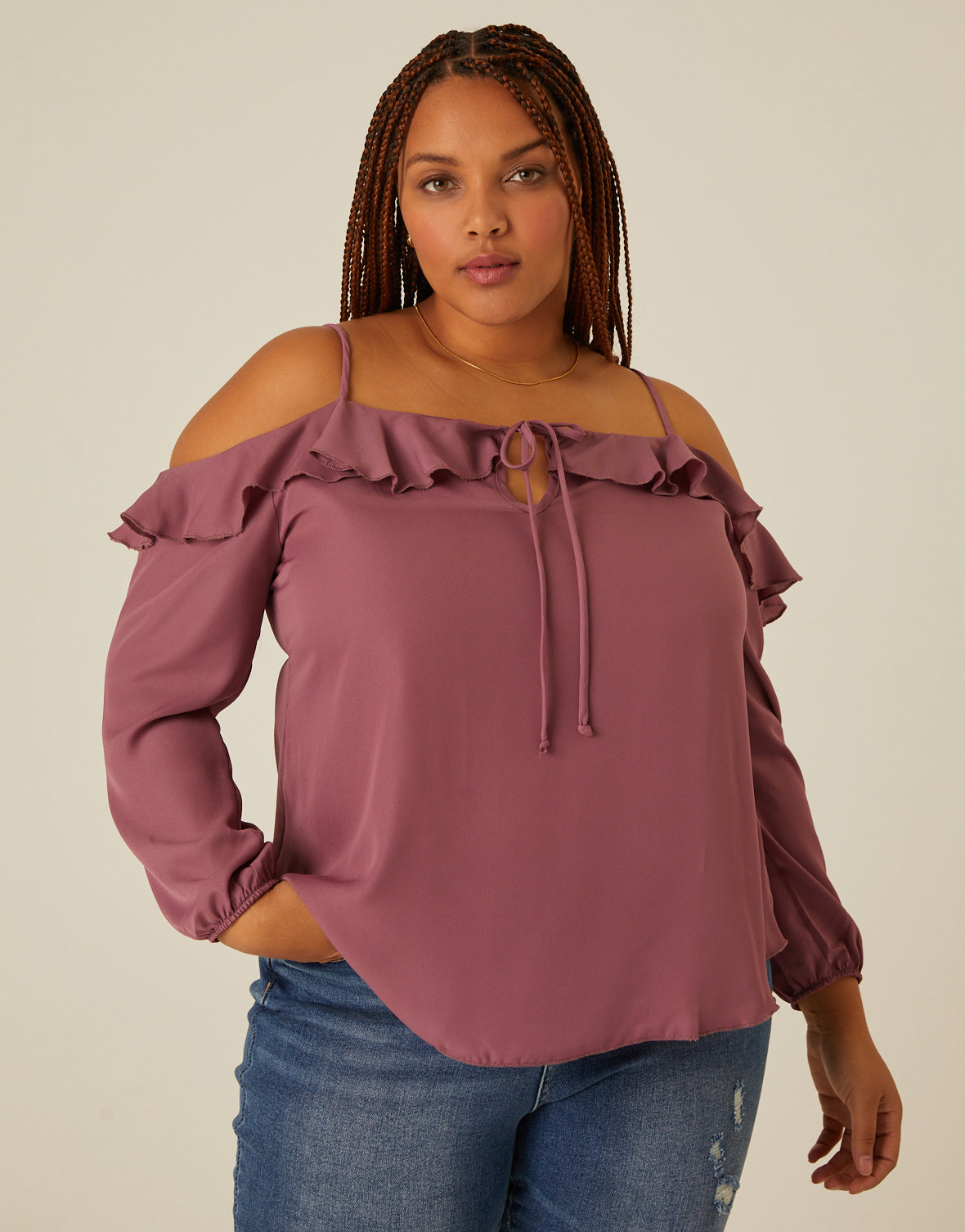A?flowy silhouette and gentle ruffling give the?Curve Cold Shoulder Ruffle Blouse a sweet, feminine vibe.