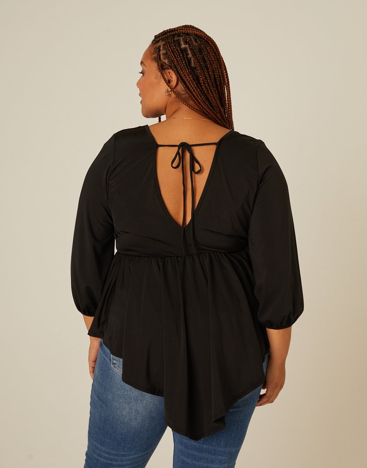 - This top features an elastic waist, three-quarter sleeves with elastic, a tie at the back of the neck, and a v-shaped, surplice neckline.