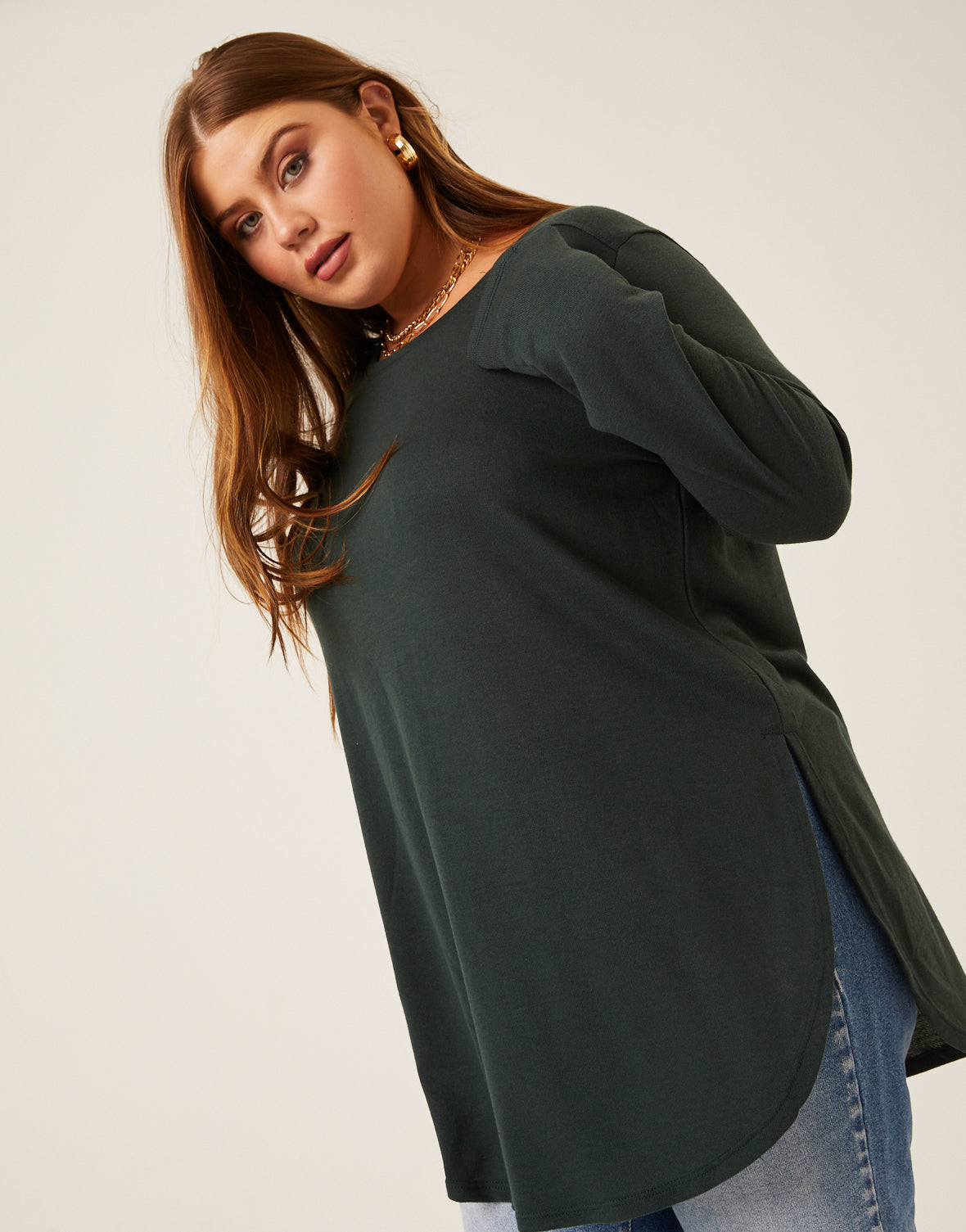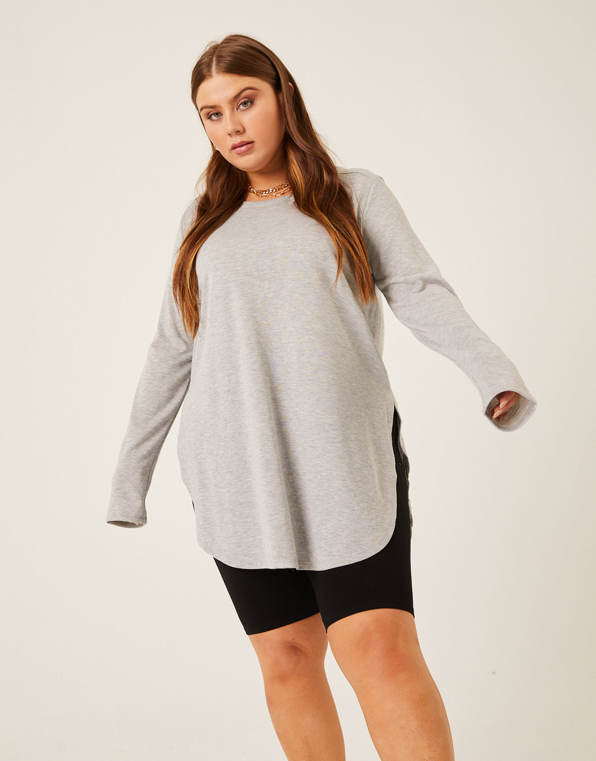 - This top features a crewneck neckline, long sleeves, and a rounded hem with slits on either side.?