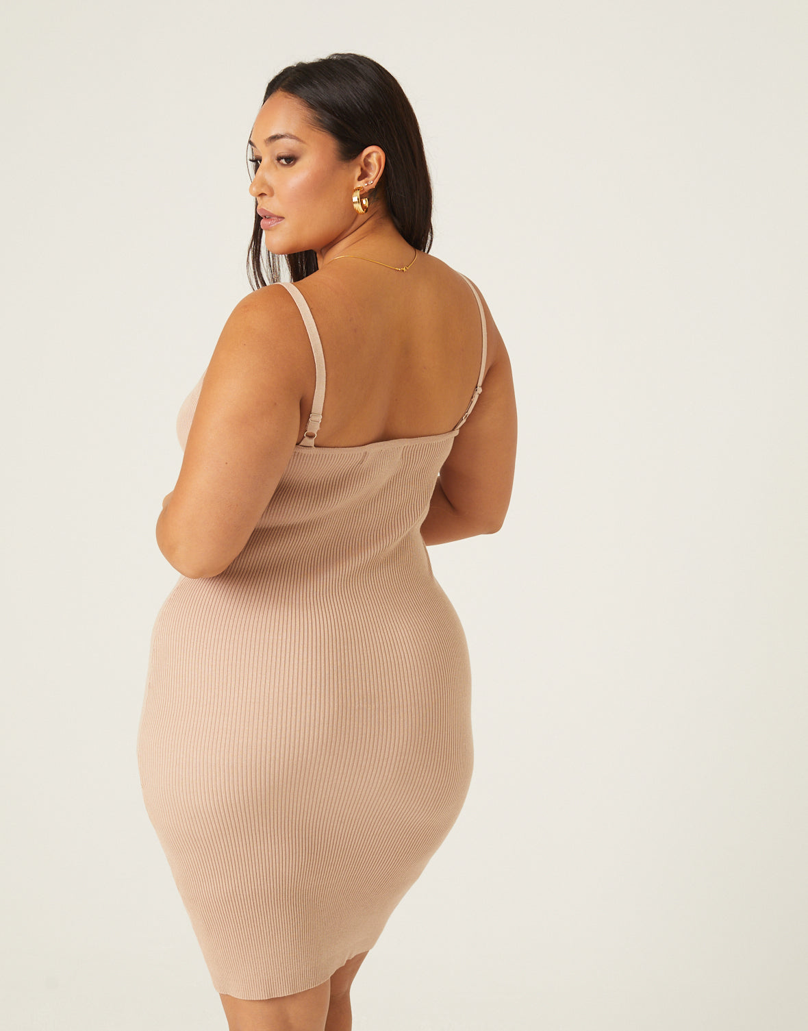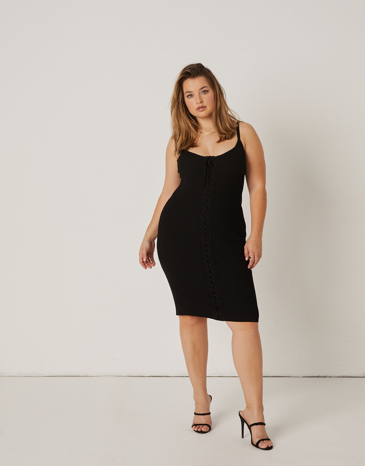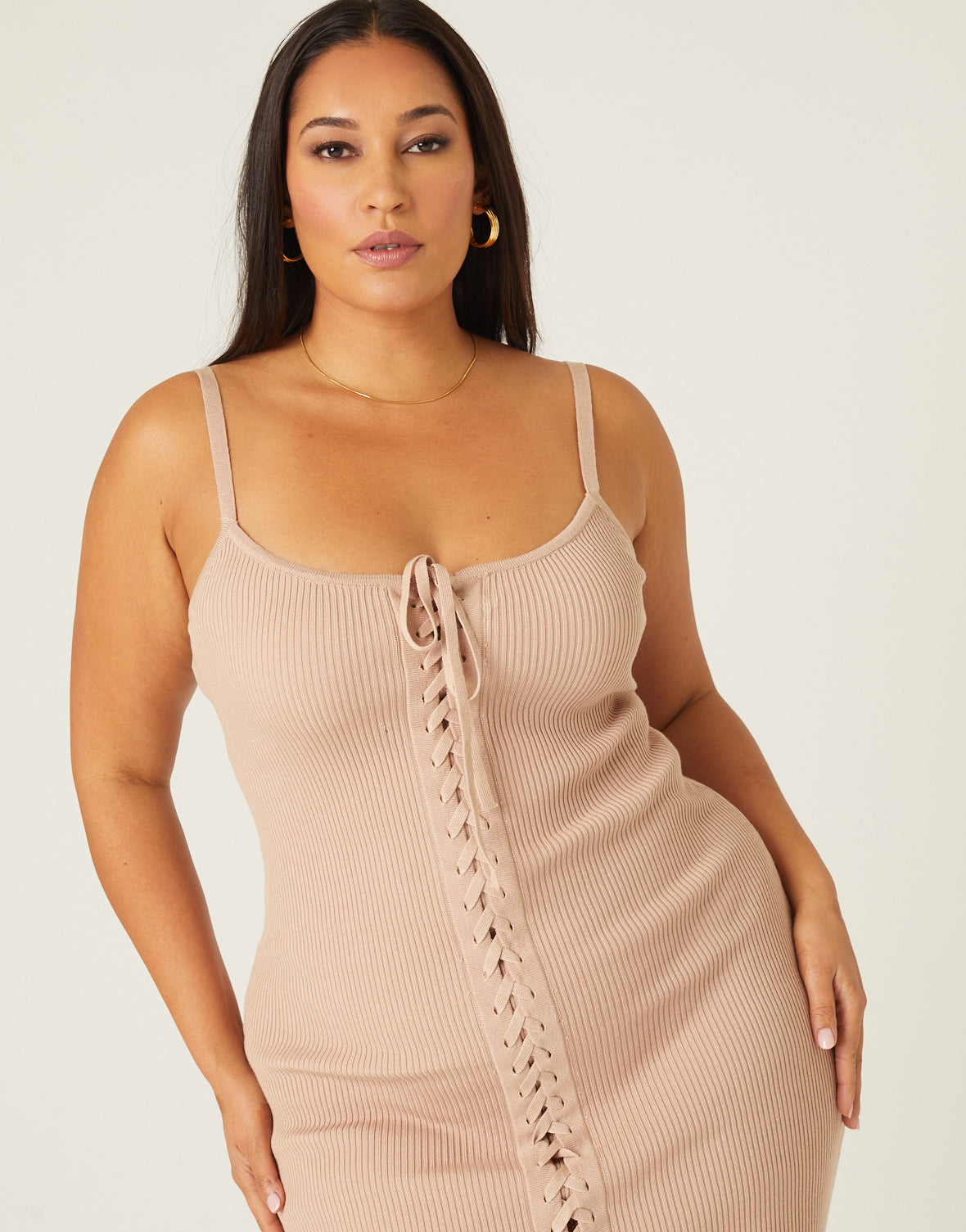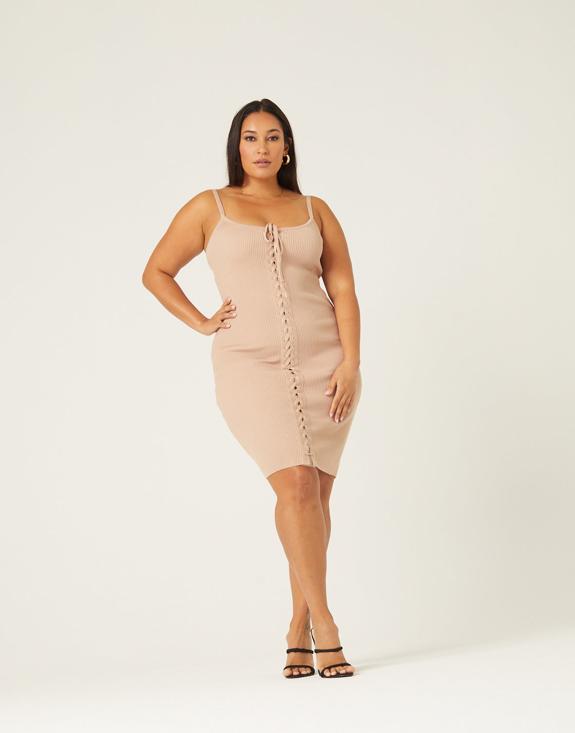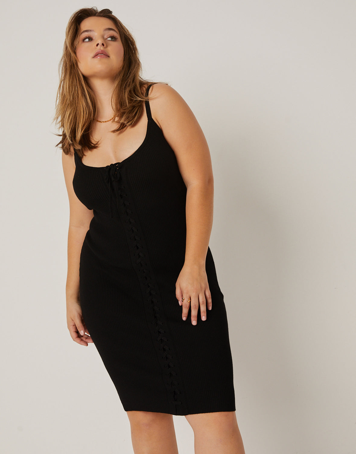 - This dress features a rib knit material, a lace-up detail up the front, adjustable spaghetti straps, and a bodycon silhouette.