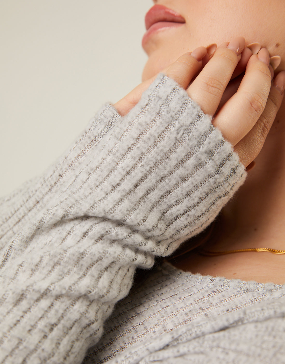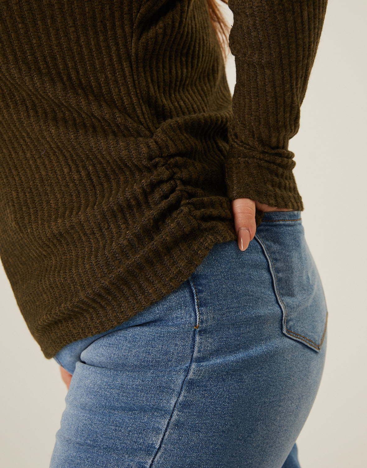 - The material is a soft and stretchy ribbed knit.