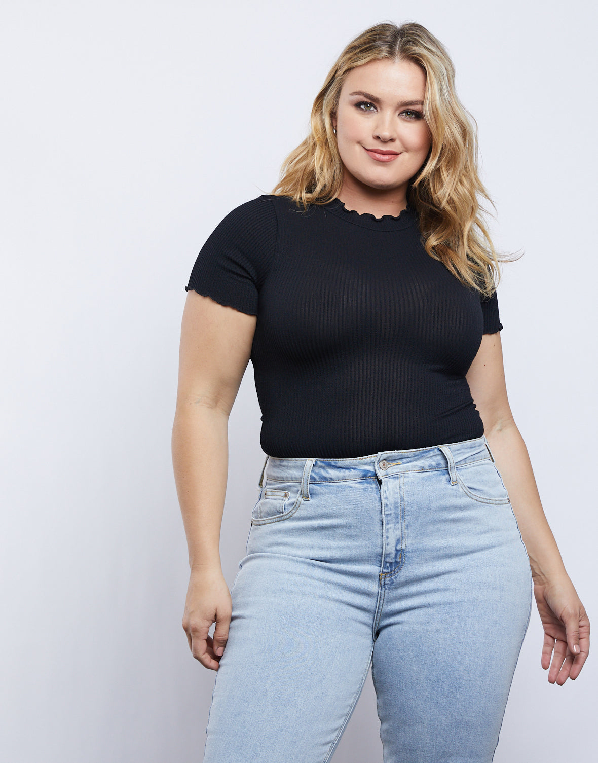 The Curve Mock Neck Top is a great essential basic. This ribbed knit short sleeve lettuce hem tee has plenty of stretches and is not cropped. A great shirt to wear tucked in with some cute bottoms. This tee has a high neck that only reaches a bit over the collarbone, to give a sleeker look without the intenseness of a turtleneck.? Wear this top to work, to lunch, on a night out, or to run errands. This top is effortlessly versatile and comfortable to wear!